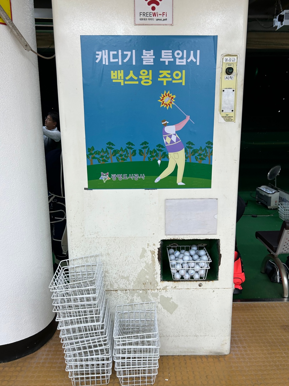 이번 시설 개보수 공사로 자동 볼 분배 시스템이 도입될 줄 알았는데 그게 아니었다. 광명골프연습장 1층에는 클래식한 연습공 유통업체를 사용하고 있습니다. 아래 사진의 연습구 머신에서 연습공을 받은 후, 골프공을 플레이트에 있는 캐디 머신에 넣습니다.